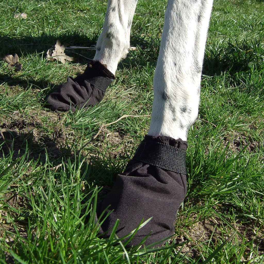 De bootie hoort niet strak om de poot te zitten. De hond moet zijn tenen kunnen spreiden wanneer de poot belast wordt. Het klittenband kan wel strak om de poot vastgemaakt worden.